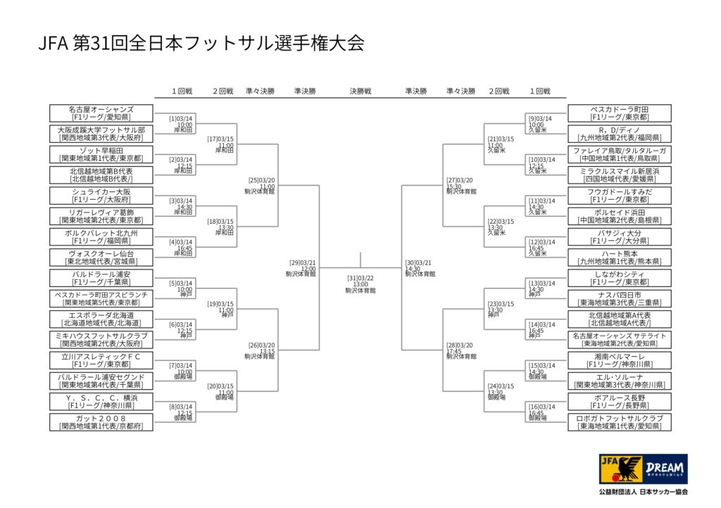 3/14(土)~ 3/22(日)に大阪、兵庫、福岡、静岡、東京で開催されるJFA第31回全日本フットサル選手権の組み合わせが決定しましたので、お知らせいたします。